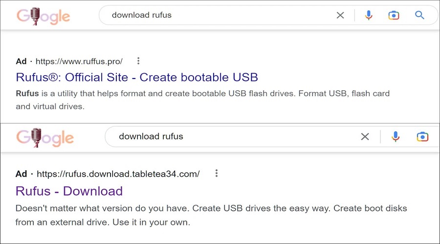 One example we found is a Google Ad search result for Rufus, a free utility for creating bootable USB flash drives.